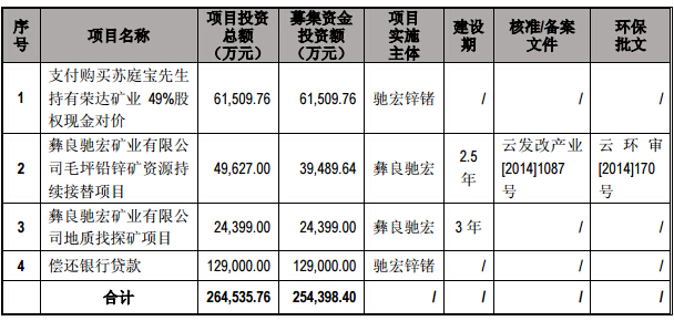 根據(jù)《云南馳宏鋅鍺股份有限公司發(fā)行股份購買資產(chǎn)并募集配套資金暨關(guān)聯(lián)交易報(bào)告書(修訂稿)》的相關(guān)規(guī)定,本次募集資金扣除發(fā)行相關(guān)費(fèi)用后將投資于以下項(xiàng)目: