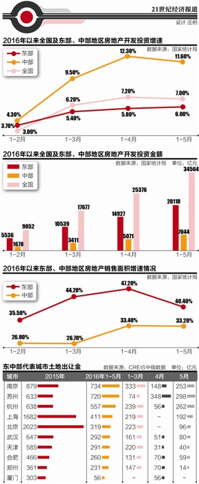 不過,整個4月,作為一線城市的北京和上海竟無一幅地塊出讓,而到了5月,北京、上海、蘇州、南京、杭州開始集中供地,僅這5個城市當(dāng)月的土地出讓金就高達(dá)1101億元。作為中部城市的合肥、武漢、鄭州等地卻放慢了供地節(jié)奏,這成為導(dǎo)致中部地區(qū)房地產(chǎn)開發(fā)投資增速在5月首次調(diào)頭向下的主因。