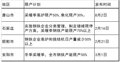 2017年2月,環(huán)保部、京津冀及周邊地區(qū)大氣污染防治協(xié)作小組于今年2月份發(fā)布《京津冀及周邊地區(qū)2017年大氣污染防治工作方案》,《方案》實施范圍為“2+26”個城市,即京津冀大氣污染傳輸通道包括北京市,天津市,河北省石家莊、唐山、廊坊、保定、滄州、衡水、邢臺、邯鄲市,山西省太原、陽泉、長治、晉城市,山東省濟南、淄博、濟寧、德州、聊城、濱州、菏澤市,河南省鄭州、開封、安陽、鶴壁、新鄉(xiāng)、焦作、濮陽市!斗桨浮分兄赋,各地實施鋼鐵企業(yè)分類管理,按照污染排放績效水平,制定錯峰限停產(chǎn)方案。石家莊、唐山、邯鄲、安陽等重點城市,采暖季鋼鐵產(chǎn)能限產(chǎn)50%,以高爐生產(chǎn)能力計,采用企業(yè)實際用電量核實。采暖連續(xù)限產(chǎn)今年是第一年執(zhí)行,之前河北、山東、山西執(zhí)行的都是臨時限產(chǎn)方案,根據(jù)具體天氣狀況執(zhí)行。