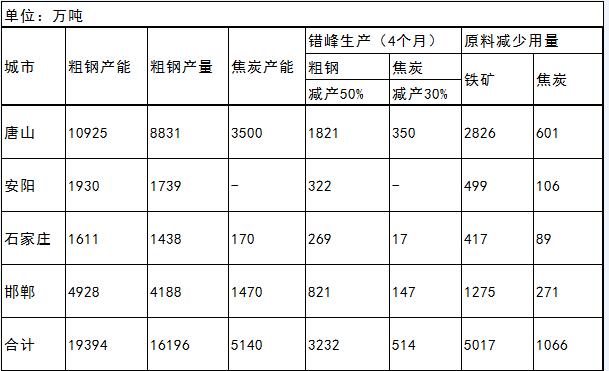 摘要:《京津冀及周邊地區(qū)2017年大氣污染防治工作方案》中提出的“2+26”城市實施工業(yè)企業(yè)采暖季錯峰生產(chǎn)等措施,要求石家莊、唐山、邯鄲、安陽等重點城市,采暖季鋼鐵產(chǎn)能限產(chǎn)50%,以高爐生產(chǎn)能力來計算,通過企業(yè)實際用電量來核實。以采暖季錯峰生產(chǎn)4個月為例進行測算,若嚴格執(zhí)行四大重點城市粗鋼累計減產(chǎn)3232萬噸,月均達808萬噸,共計影響礦石用量5017萬噸、焦炭1348萬噸。