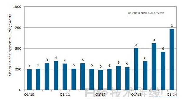 2014年一季度,夏普的太陽能電池模塊出貨量時隔五年重返全球第一寶座,這是NPD Group的太陽能電池部門Solarbuzz在該公司的季度組件跟蹤報告“Module Tracker Quarterly”中公布的。