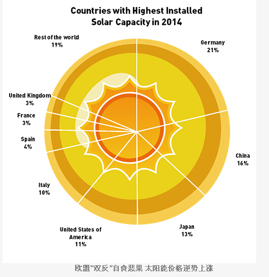 自2000年起,德國的可再生能源法刺激了太陽能產(chǎn)業(yè)迎來黃金發(fā)展期。其中最重要的一點,就是保障所有太陽能項目的電價能夠以顯著高于市場價格的水平出售給電網(wǎng)運營商。但是,隨著中歐太陽能貿(mào)易摩擦愈演愈烈,就目前來看,德國仍然是世界上領(lǐng)先的太陽能市場。但是,較之10年前,德國的太陽能產(chǎn)業(yè)已經(jīng)蒙上了一層陰影。統(tǒng)計顯示,2014年,歐洲太陽能電池制造商的產(chǎn)能占全球的8%。但是,中國的產(chǎn)能占全球的64%。