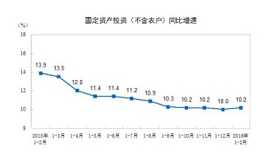 據(jù)中國國家統(tǒng)計(jì)局最新公布,2016年1-2月,中國固定資產(chǎn)投資(不含農(nóng)戶)38008億元,同比名義增長10.2%。從環(huán)比速度看,2月份固定資產(chǎn)投資(不含農(nóng)戶)增長0.83%。