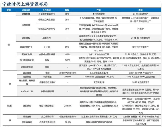 寧德時(shí)代采取鋰鎳鈷資源全面布局策略,鎖定了國(guó)內(nèi)外優(yōu)質(zhì)礦山:國(guó)內(nèi)布局宜春+四川鋰礦、湖北+貴州磷礦,海外布局非洲鋰礦、玻利維亞鹽湖、印尼紅土鎳礦、以及非洲銅鈷礦,并與眾多原材料成立合資公司。