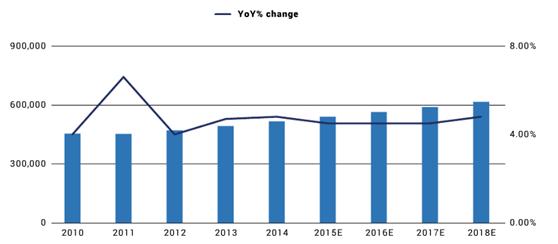 2014年,哥倫比亞名義GDP估計在5166億美元,預計2015~2018年間年復合增長為4.5%,2018年GDP將達到6165億美元。