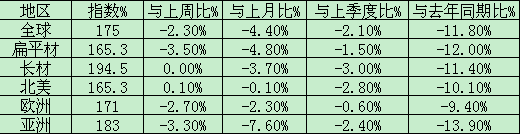 上周國際鋼市疲軟。CRU國際鋼價綜合指數(shù)為175,低于前一周的179.1。CRU扁平材指數(shù)為165.3,低于前一周的171.4;CRU長材指數(shù)為194.5,維持前一周水平。其中,歐洲市場CRU價格指數(shù)為171,低于前一周的175.7;北美市場CRU價格指數(shù)為165.3,高于前一周的165.1;亞洲市場CRU價格指數(shù)為183,低于前一周的189.2。